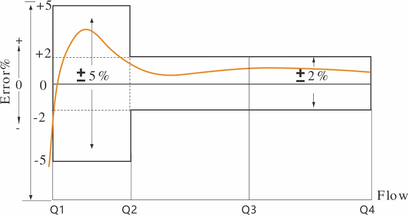 | ข้อผิดพลาดสูงสุดที่อนุญาตสำหรับโซนอัตราการไหลส่วนบน (MPEμ) | ± 2% สำหรับน้ำที่มีอุณหภูมิ≤30℃ | ||||||||||||||